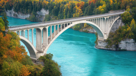 This stunning image captures a historic bridge spanning a vibrant turquoise river, surrounded by lush autumn foliage. The serene landscape invites exploration and adventure.