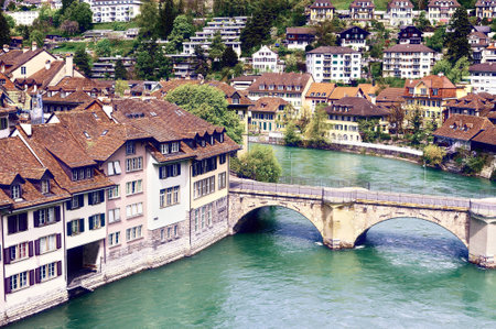 Bern, Switzerland - May 26, 2016: View of the Aare River, bridge and houses with tiled rooftops at Bern, Switzerland