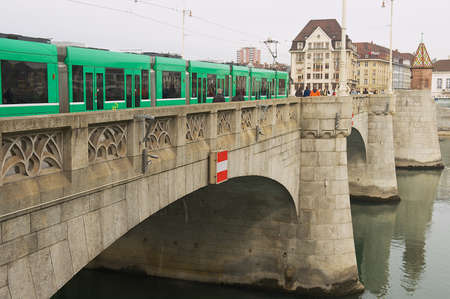 Basel, Switzerland - March 01, 2009: Tram passes by the bridge over Rhine river in Basel, Switzerland.