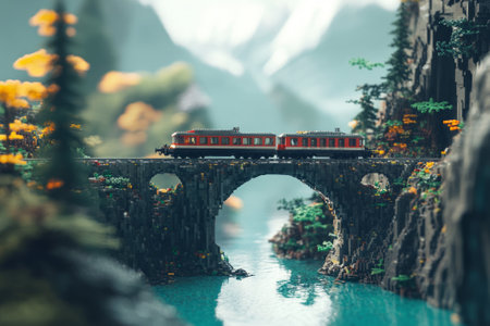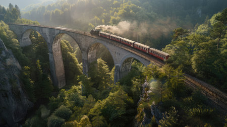 Generative AI A panoramic view of a train traveling across viaducts and bridges, offering stunning vistas of mountain valleys.