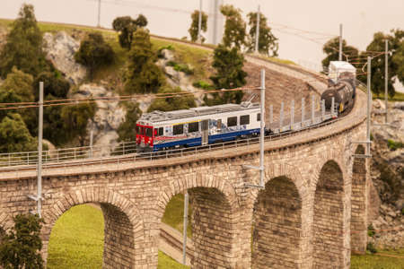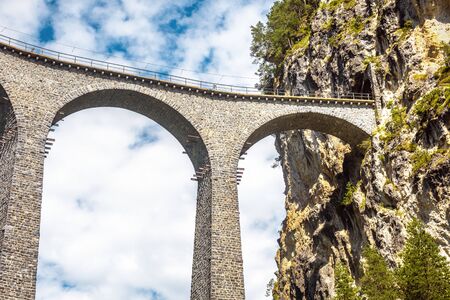 Landwasser Viaduct in Filisur, Switzerland. It is a famous landmark of Swiss. High bridge and tunnel in Alpine mountains close-up. Amazing railway bridge in summer. Concept of transport in Europe.