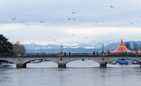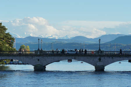 Quay Bridge in Zurich, Switzerland, with Limmat river in the foreground and Lake Zurich and Alps in the background. There is busy traffic and a lot of people.