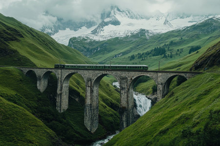 A scenic train journey across an old bridge in switzerland amidst majestic mountains and waterfalls