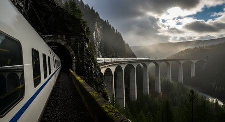 A dramatic and scenic view of a modern high-speed train entering a tunnel carved into a rugged mountain. In the distance, another train crosses a magnificent arched viaduct over a river valley, with sunbeams breaking through moody clouds above.