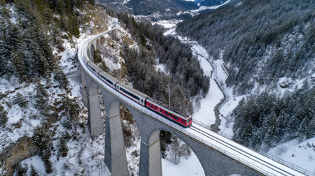 A picturesque view of a train crossing a curved viaduct in a snowy landscape, surrounded by majestic mountains and dense forests, capturing winter's beauty.