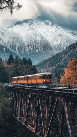 A bright orange train travels across a towering bridge amidst a colorful autumn forest. Snow-covered mountains rise in the background under a moody sky.