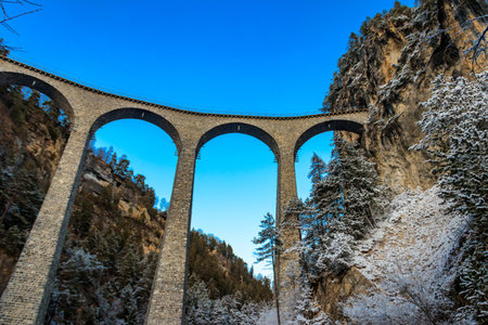 View of Landwasser Viaduct, Rhaetian railway, Graubunden in Switzerland at winter