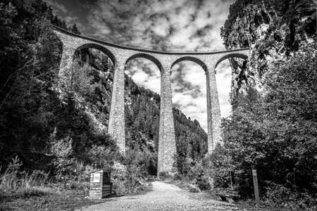 Landwasser Viaduct in Switzerland. Scenic high bridge, landmark of the Swiss Alps. Rhaetian railway in black and white photo. Concept of travel, Bernina Express, Alpine mountains, rail and landscape.