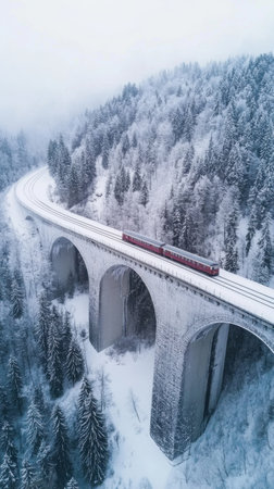 A vibrant red train travels across a majestic viaduct surrounded by snow-laden trees in a serene winter landscape. The scene captures the beauty of nature and travel.