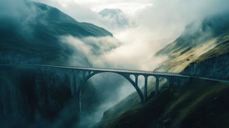 Aerial view reveals a stunning bridge spanning a foggy valley, with soft sunlight filtering through the mist, creating a mystical atmosphere.