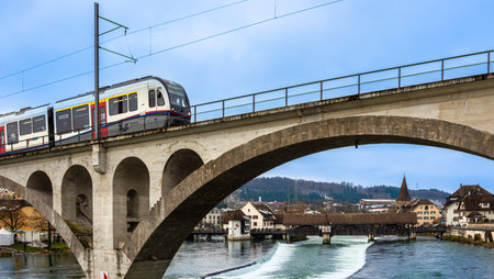 Bremgarten, Switzerland - December 7, 2023: Bremgarten is a small town and municipality in the canton of Aargau in Switzerland. The train on the bridge over river Reuss