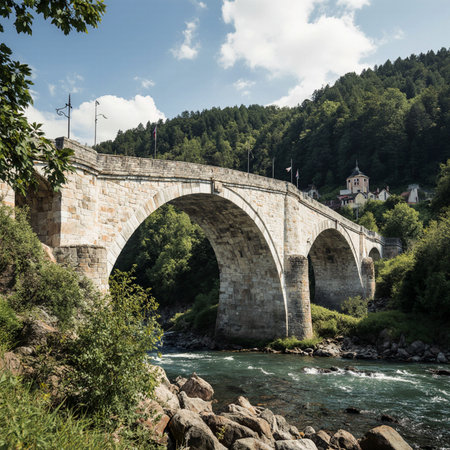 A stone arch bridge gracefully spans a deep gorge carved through rugged terrain, connecting rocky cliffs under a soft sky, evoking a sense of natural wonder and architectural ingenuity.
