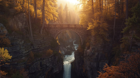 A captivating misty landscape showcasing an arched bridge nestled amidst a lush green forest. Vibrant autumn foliage enhances the serene atmosphere, inviting exploration.