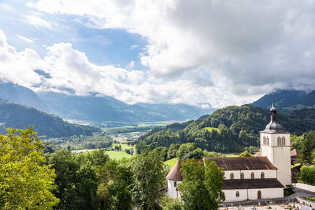 View of the valley and St. Theodula's Church from Castle Gruyeres, Switzerland