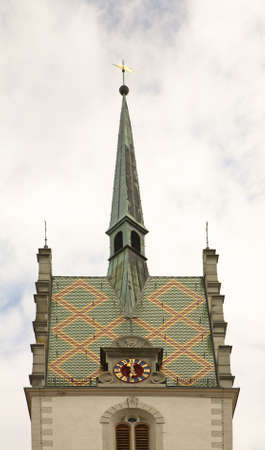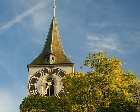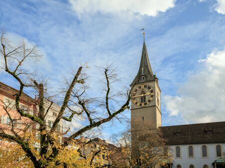 View of the ancient St. Peter Church in autumn - one of the four main churches of the old town of Zuerich, Switzerland, Europe.