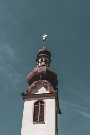 Landeck Tyrol Austria May 30, 2025 Barbara church cathedral Barbarakirche Fliess with dome tower and blue sky in the Alps Fliess Landeck Tyrol Austria.