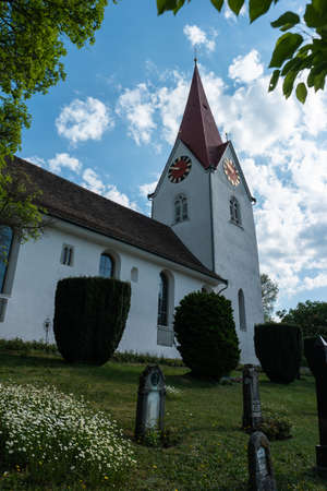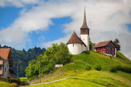 Traditional white wooden church on a green hill in central Switzerland near Zurich