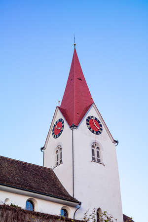 Sunset in Lucerne, Switzerland. Panoramic view of the Chapel of St. Peter in Lucerne.