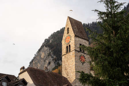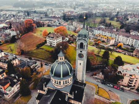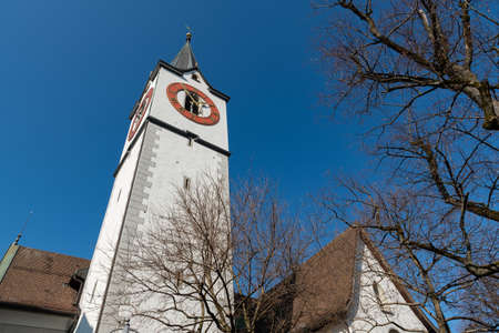 Saint Gallen, Switzerland March 9, 2022 Tower of the Saint Fiden catholic church in the city center on a sunny afternoon