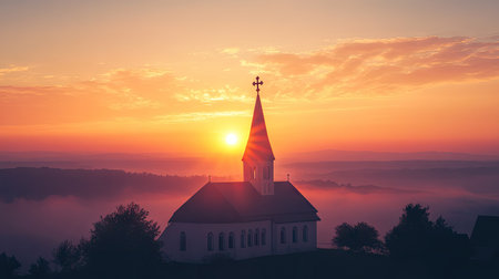 A serene sunrise over a church with a cross on the steeple, symbolizing the resurrection and hope of Easter morning
