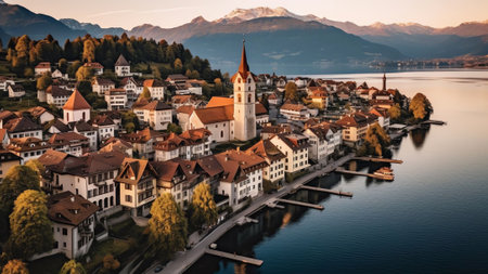 Generative AI : Aerial view of the beautiful little town of Lindau on the Lindau Island at Constance lakefront Germany