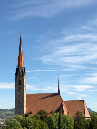 SCHAAN, LIECHTENSTEIN, JULY 6, 2021 Tower of the catholic church in the center