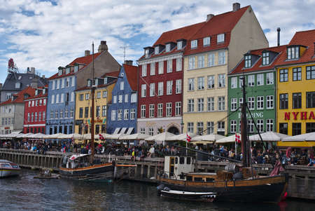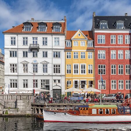 Copenhagen, Denmark - July 20, 2015: Traditional houses and boats in the Nythavn canal