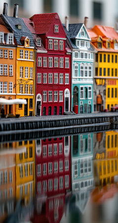 A row of vibrant miniature buildings is featured, reflecting in calm water. The composition showcases detailed architecture and rich colors. The image presents a daytime scene with warm sunlight illuminating the structures, and could be utilized for various commercial and editorial projects.