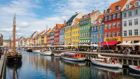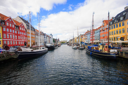 Copenhagen, Denmark - August 8, 2023: The most famous canal in Copenhagen with its quaint colorful houses overlooking the docked sailboats.