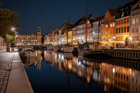 Nighttime view of Nyhavn canal in Copenhagen showcasing colorful buildings and serene waters