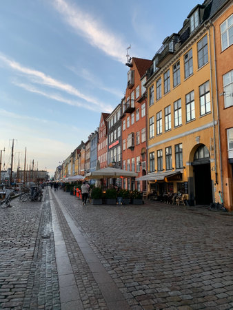 Nyhavn (New Harbor), Copenhagen, Denmark - 14 JMay 2019: Sunset view of Nyhavn pier with color buildings, ships, yachts and other boats in the Old Town of Copenhagen, Denmark, Europe