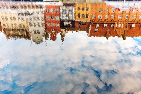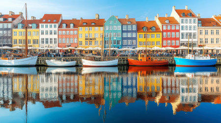 The colorful buildings of Nyhavn in Copenhagen, Denmark, reflected in the peaceful waters of the harbor.