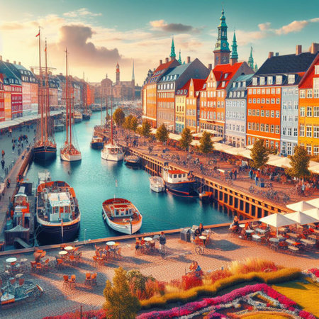 Vibrant, historic buildings line the canals of Nyhavn in Copenhagen, showcasing a mix of colors and architectural styles. Boats rest nearby, creating a lively atmosphere for visitors.