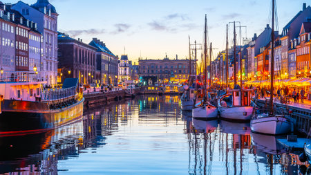 Discover the enchanting atmosphere of Copenhagen’s Nyhavn Canal with this image that captures the historic waterfront and its colorful townhouses under the soft twilight sky. The calm waters reflect the warm lights, creating a tranquil scene in the heart of the city.