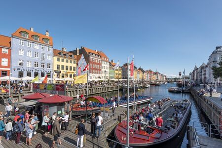 Copenhagen, Denmark - August 23, 2017 Panoramic view at Nyhavn Canal in Copenhagen city. Colorful facades, old ships, touristic boats and crowd of tourists make Nyhavn the most lively place in the capital.