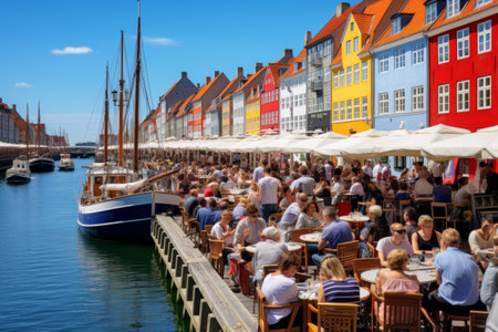 Copenhagen, Denmark - August 22, 2019: Famous Nyhavn pier with colorful buildings with people enjoying the terraces in Copenhagen, Denmark
