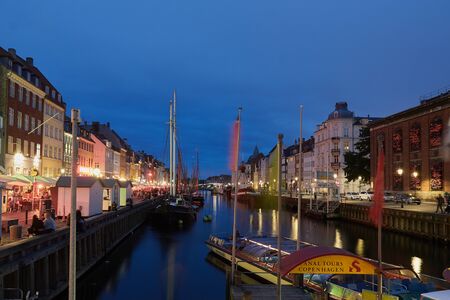 Nyhavn (New Harbor), Copenhagen, Denmark - 14 JMay 2019: View of Nyhavn pier with color buildings, ships, yachts and other boats in the Old Town of Copenhagen, Denmark, Europe. Night time,