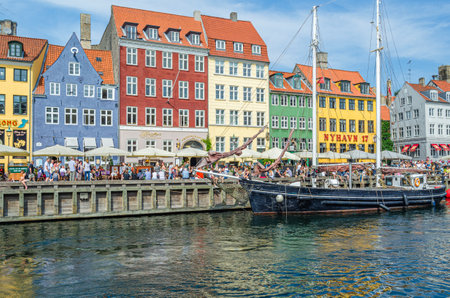 COPENHAGEN, DENMARK - JULY 8 2014: View of colorful houses, bars, restaurants and tourists in Nyhavn, a 17th-century waterfront, canal and entertainment district in Copenhagen, Denmark