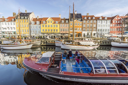 Copenhagen, Denmark, September 20, 2017: Nyhavn district is one of the most famous and beautiful landmark in Copenhagen, Denmark in a sunny day