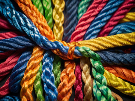 Intertwined ropes of diverse colors symbolize unity and synergy in teamwork, forming a strong, cohesive bond.