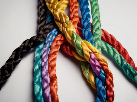 Close-up of multicolored ropes intertwined, symbolizing diverse strength and teamwork, against a neutral background.