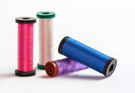 Many mixed vivid colored sewing threads for embroidery isolated on a white table, top view or flat lay of red, pink, yellow, blue and green textile materials