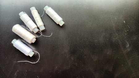 White spools of thread on a black background. Black card with texture, frame and sewing threads. Partial focus