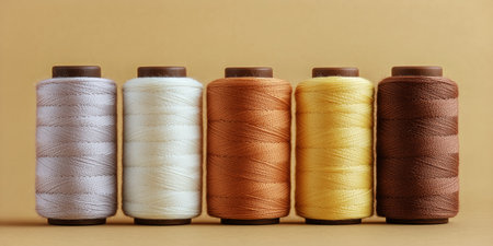 Five spools of thread in diverse colors stand proudly on a smooth surface, showcasing shades of lavender, cream, orange, yellow, and brown, perfect for any sewing project.