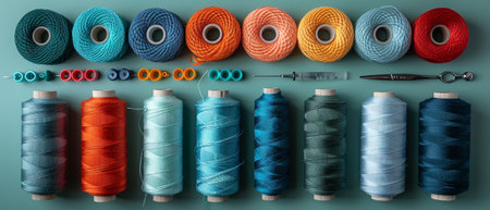 A vibrant collection of colorful sewing threads neatly arranged on spools, showcasing a spectrum of hues and textures. Ideal for crafting and textile projects.