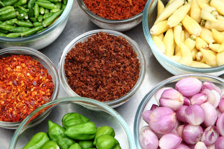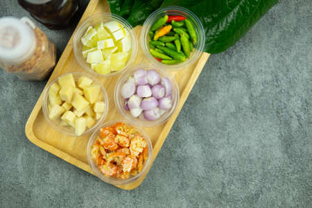 Assortment of Thai food Cooking ingredients and Paste of thai popular food red curry and green curry