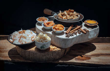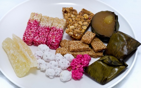 Chinese desserts, Snack mix nuts candies sweets sugar sliced nuts sesame seeds coated beans grains puffed rice candied winter melon, Thai and chinese pay respect to god in chinese new year festival