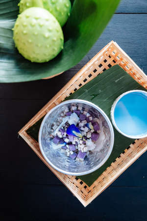 Taro Dumplings in coconut cream mix with butterfly pea, Bua Loi, Dessert of Thailand.