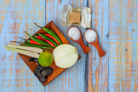 Wooden plate with salt, msg,ginger,garlic,onion,key lime, chilies, chicken stock cube, and lemongrass over the wooden cutting board.