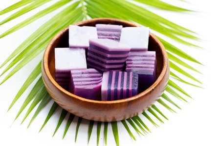 Overhead view of traditional nyonya kueh on banana leaf rattan tray on white background